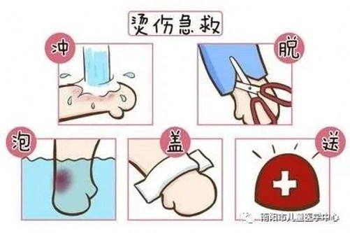 1、冲:脱离热源后,即刻用自来水或洁净水冲洗受伤局部以降温。烫伤后的3小时内都应进行冲水。因为即使脱离热源,受伤局部温度仍较高,需尽快降温以减轻其对深部组织的损害。对于不宜冲洗的部位可使用常温水冷敷降温。一般需冲15~20分钟。不要用冰块降温,温度过低可能导致二次伤害。