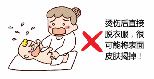 2、脱:凉水降温后,可轻柔地去除孩子的衣物,如果难以去除,可用剪刀剪开。如果衣物和皮肤粘连在一起,切不可强行拉扯,以免加重烫伤皮肤的损害,可待就医后进一步处理。